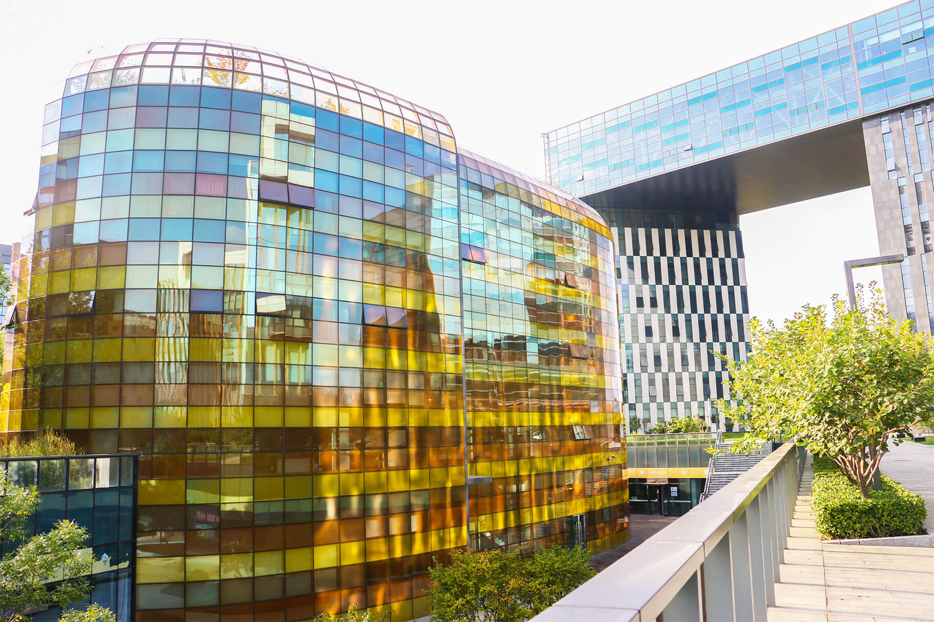 外形呈橢圓形,是園區內具有特色的建筑,建筑面積3421㎡,最高3層,高度約為18m,用于展示中心、會議中心、服務中心。